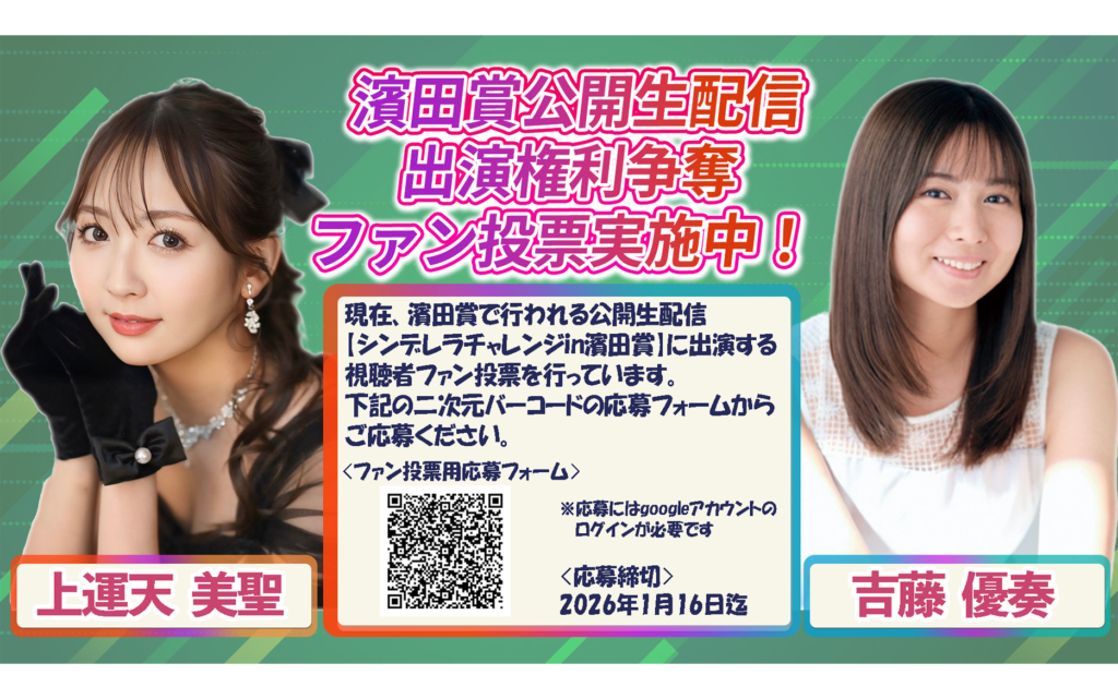 2026.01.13 その他 【濱田賞出演権利争奪ファン投票】 小倉けいりん シンデレラチャレンジ 濱田賞ファン投票 募集フォーム 2/7~9小倉競輪場で行われる【スーパーナイター濱田賞×スピチャン・スカパー杯】のYouTube公開生配信に出演する権利をかけたファン投票を実施中! たくさんのご投票をお待ちしております!※締切1月16日まで