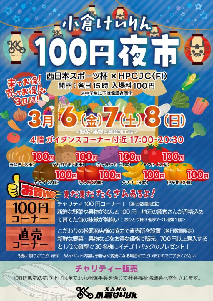 ●小倉けいりん100円夜市( 新鮮な野菜果物の100円チャリティ販売や松尾商店の通常販売を実施,数に限りあり)