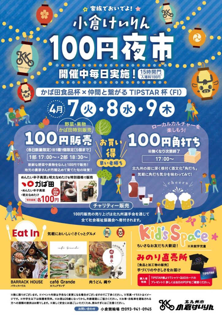 ●小倉けいりん100円夜市( 新鮮な野菜果物の100円チャリティ販売や100円角打ちコーナー、地元青果店の直売所出店、飲食コーナー)